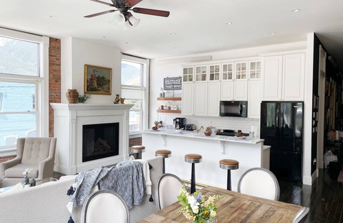 Gorgeous, upstairs 2 bedroom, 2 full bath loft-like apartment in the center of all the action in Silverton, Colorado in the heart of the scenic San Juan Mountains. Remodeled in 2017, this spectacular space offers panoramic views of the mountains and the main street of town from all windows, particularly from the loft like living room-kitchen area. The Greene St. Loft sits at the front part of this historic 1895 brick building, overlooking the main street of town. Decorated by a professional decorator, this apartment offers the perfect mix between antique, vintage, and modern decor.