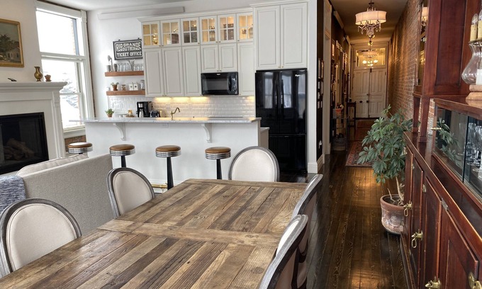 Fully equipped kitchen with marble countertops, brass fixtures, and new appliances to include gas range, microwave, dishwasher, and French style full-size refrigerator. Dining table seats six. The original soda fountain cherry wood back bar graces one wall of the living room and provides storage for crystal wine glasses, tableware, family games, and books on the history of the area. Vintage soda fountain bar stools seat four at the marble bar countertop.
