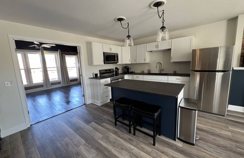 The main room has a large kitchen with an island with Trillium countertops, there are two stools underneath the island for seating. The kitchen features a Keurig coffee machine, is fully stocked with with cooking equipment, utensils, spices and oils for cooking. There is a 4 seat dining room table for eating or working on your laptop, and a storage dresser with games, cards, candles and other guest amenities. The seating area has a smart TV with a moveable mount so you can watch the TV from anywhere in the space. There are two reclining chairs in the space.