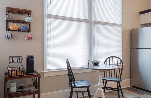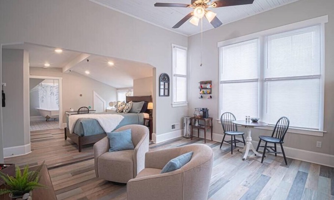 Indulge in Victorian-Era styling complemented by luxury finishes at this unique accommodation. The studio features a relaxing clawfoot tub, a fully equipped kitchen, and other high-end amenities, perfectly blending old-world charm and contemporary comforts.