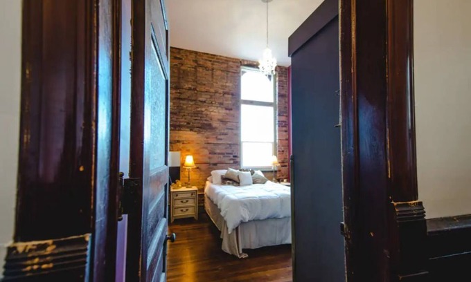 This suite was originally a dentist office from 1872! It has since been restored and converted into the most romantic getaway around. Guests will enjoy exposed brick, tall ceilings, luxurious beds, antique decor, chandeliers, table and chairs, mini fridge, microwave, wine glasses and en-suite bath with a two headed shower, and claw foot tub. Come for a solo retreat or bring your love! Wine available for purchase.
