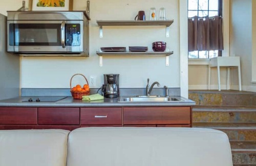 The guest house is perfect for a weekend visit. Comfortable leather couch converts to a full bed. Office desk can convert to a small dining table. Full kitchen has all the essentials including a 2 top ceramic stove top, coffee maker and microwave. The bathroom is a few steps up from the main floor and includes a walk-in shower. (see other things to note)
