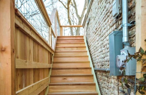 Take the beautiful cedar steps to the top landing and covered covered entry above garage. Here, our guests have a private entrance and full access to the guest house.