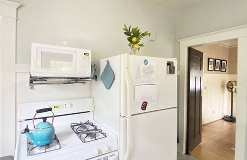 The charming craftsman-style Verna J. Smith home is perfectly located in a shaded historic neighborhood nestled between the OSU campus and downtown Corvallis. This 1175-s.f. craftsman-style cottage was built in 1918 and has been lovingly cared for and maintained over the years. It boasts three bedrooms, one-and-a-half bathrooms, a full kitchen, dining room, washer and dryer, and cozy living room with a television and gas fireplace. The large outside deck is perfect for lounging and visiting with friends. Verna will charm you with her timeless beauty and will give you a captivating look into days long past.
