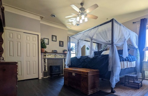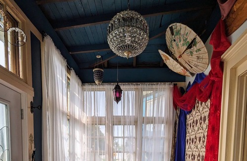 Sunflower Manor is perfect for group gatherings! There are five spacious bedrooms, each with a private full bathroom. All bedrooms have a working space, blackout curtains, and linens provided. Extensive common areas include a parlor, dining table that seats ten, pool table, sunroom, sunroom, yoga studio, and an equipped chef's kitchen. The house features classic Victorian architecture including high ceilings and charming detail work including custom designed stained glass windows.