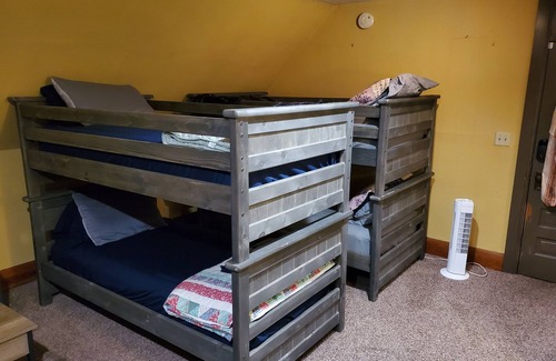 Four twin beds, kitchenette, cupboards, sink, refrigerator, microwave, and social area with futon and TV. Great when traveling with a group. Uses shared third floor bathroom. Inquire about renting whole third floor which includes South, East, and North Lofts.