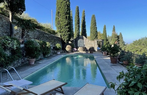 The Villa itself features 5 bedrooms and 5.5 baths, all windows swinging open to views of either the gardens or the valley. The first floor consists of a foyer/sitting room with a fireplace, a small office, a beautiful dining room with a fireplace, a fully equipped kitchen and a living room looking out onto the garden. There is gated, on-site parking for up to 4 vehicles. The home has just undergone a tasteful update, including remodeling of the bathrooms, adding air conditioning to all bedrooms, new stucco on the entire exterior, interior painting and “new” antique furniture throughout. The current owners like to cook, so guests will find that the kitchen is unusually well equipped, including modern appliances and cutlery that actually cuts. Somewhat unusual for Europe, the home also features a small bar complete with an icemaker. Although the Villa has 5 bedrooms, the seating inside and around the pool and grounds is all set up for 8 guests, which is what the owners recommend as a maximum for the property, to ensure a spacious and uncrowded feel in keeping with the property’s ambiance.