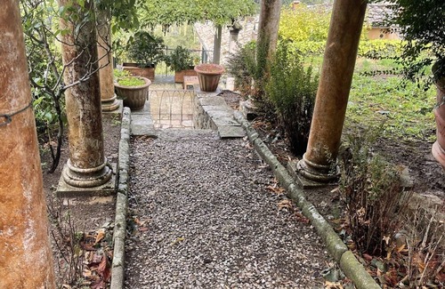The approach to the property begins where the paved road ends. A semiprivate, gravel drive will bring you to the property in approximately 3 minutes by car. Although the gate entering the property is only an 11 minute, scenic walk from its counterpart Roman gate entering the town, the property’s isolated and wooded location renders the town, as well as any neighbors, unseen from the Villa and vice versa. The views during your approach of the valley below and through the woods are lovely.