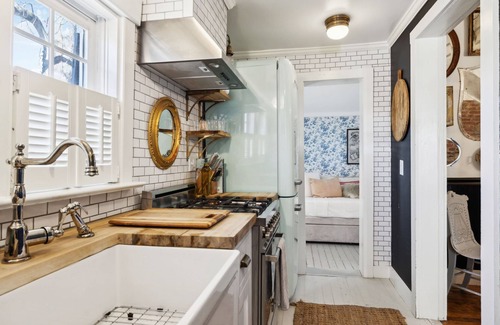The chic kitchen, equipped with a mint-green Smeg refrigerator and a Bertazzoni Italian stove, is perfect for preparing home-cooked meals. The antique farm table in the dining room is surrounded by vintage décor that tells a story of its own. The bathroom boasts a deep soaking tub and a handheld shower, as well as a stunning brass console sink. The original 1892 entry doors are painted a calming pink in contrast to the original black screen doors.