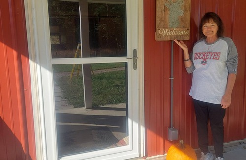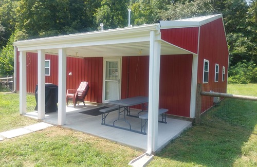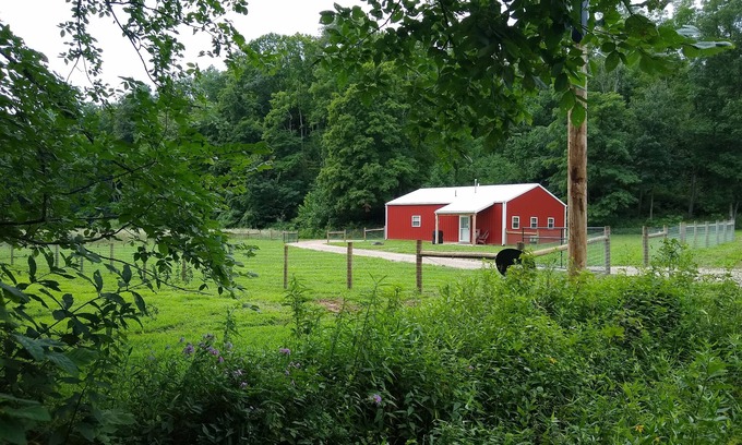 You will be staying in a newer post frame building on 62 rural scenic acres that will accommodate up to 4 guests. Located northwest of McArthur in Vinton County Ohio about 8 miles from Hocking Hills State Park and related attractions. Two separate bedrooms, each with a queen size bed. Living area with reclining sofa, recliner/rocker, big screen TV, and wifi. Fenced front barnyard with gas grill and firepit.