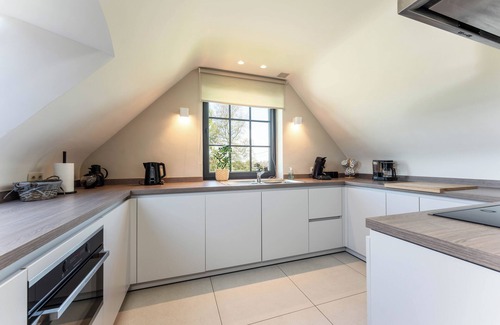 This entire rooftop flat with private entrance is part of HOEVE DEN AKKER, a beautiful domain with park garden and fantastic views in the middle of rural Moerkerke, Damme. The flat is very spacious and has 1 master bedroom with box spring, a bathroom with bathtub and large rain shower. The tastefully decorated living room is spacious with a comfortable corner lounge and possibility of two single beds. The kitchen is also luxurious and fully equipped. Unwind in this gem!