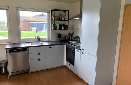 The ground-floor holiday accommodation offers space for a maximum of 6 people. There are two double bedrooms and a further room with 2 single beds. From the living room with a cosy sofa area, you can access the terrace belonging to the bungalow, which offers a wide view of the adjacent meadows across the garden. The open-plan kitchen is fully equipped with a dishwasher, fridge, hob and oven and has a separate dining area where you can eat or play together. The bungalow also has a modern bathroom with shower and WC as well as a separate guest WC. The garden adjoining the terrace can be used for sunbathing or playing.