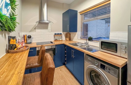 Shower Room: Cubicle Shower, Toilet. Gas central heating, electricity, bed linen, towels and Wi-Fi included. No smoking.. Refurbished throughout in 2025, this pretty ground floor apartment in the heart of Newbiggin by the Sea awaits. Decorated in rich green and golds with a large Smart TV this super retreat is warm and cosy with ample space for up to three adults. The quirky light up sign in the well-equipped kitchen is a fun edition from the local owners. This charming retreat has a double room for peaceful nights and an additional sofa bed in the living room for an extra guest.