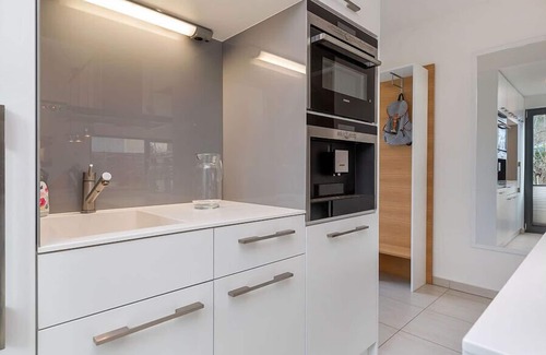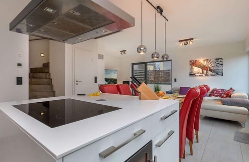 The holiday apartment has 3 bedrooms. The apartment also has a fireplace (gas), terrace on the ground floor, 3 bathrooms, etc. The apartment is equipped with every comfort imaginable. On the ground floor there is a bedroom, the spacious living/dining area with an open kitchen and a small bathroom. There are 2 bedrooms on the top floor (each with their own bathroom), one of the bedrooms is equipped with a sauna and whirlpool.