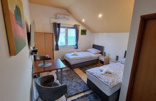 The nearest grocery shop is just 200 metres away. There are two supermarkets in the town centre. It is 100 metres to a children’s playground. There are three guesthouses near the house, offering sumptuous cuisine with regional specialities. The local bus stop is a kilometre from the accommodation. In summer you will be enticed by the Copacabana leisure pool in Osijek, ten minutes away by car.