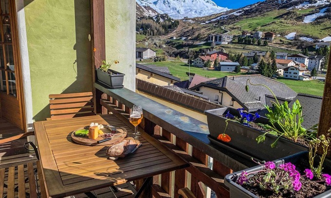 We rent out a newly renovated holiday flat with a view of the idyllic village of Bivio and the surrounding mountain landscape. The ski lift, shops, bus station, several restaurants and a large playground are all within a 4-minute walk (approx. 200 metres). The holiday flat comprises a bedroom with double bed, an open-plan kitchen with modern kitchen appliances, a dining area with a cosy corner bench and a living room area with TV. Wifi and Smart TV are free of charge. The flat is rounded off with a 20m2 sunny terrace with a view of the mountains and the ski piste. There are up to 4 sleeping places (double bed, foldaway bed, sofa bed). The flat is easily accessible from the underground car park via a lift and is located on the 8th floor.