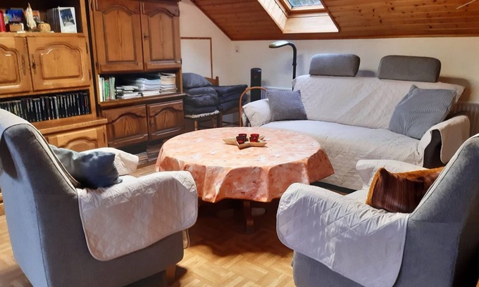 The holiday apartment "Breuer" is located in Lind-Plittersdorf and impresses guests with a beautiful mountain view. The 75 m² accommodation is situated on the top floor and consists of a living room with a sofa bed for one person, a fully equipped kitchen, two bedrooms and a bathroom, accommodating up to five people. Amenities include Wi-Fi, a TV with DVD player, heating, and a fan. A baby cot and a high chair are also available.