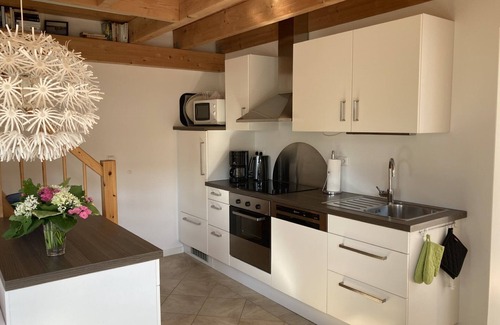 This holiday home, 55m², is ideal for 2 people and is situated in a stunning location in Germany’s smallest town, offering views of the marina and direct access to the Schlei. Completed in August 2012 and very well maintained, the Swedish-red wooden house is fully insulated. Floor-to-ceiling windows facing the Schlei are featured both in the downstairs living room and in the upstairs gallery.