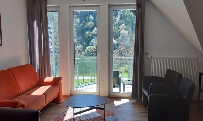The flat's balcony promises relaxing hours outdoors with a picturesque view of the Moselle. This private outdoor area invites you to start the day with breakfast in the fresh air or end the evening with a glass of wine. Please note that the entire house, including the balconies, is non-smoking and barbecues are not permitted.