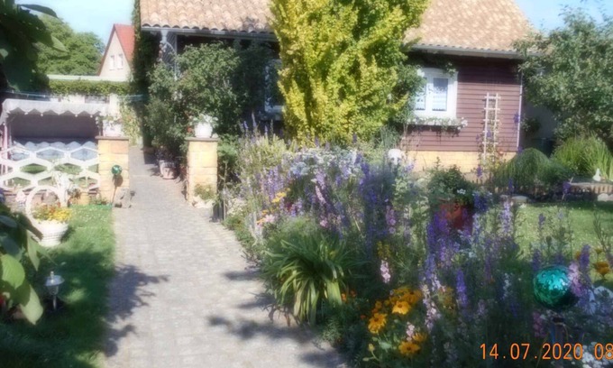 The holiday apartment is located in a detached single-family home built in 1954, was renovated in 2019 and is furnished in a functional and typical country style. The property is located on the outskirts. Also due to the view over a panorama from the property and its quiet and sunny location the domicile is popular. Available for your exclusive use: sunbathing lawn, parasol, barbecue facilities, terrace, pavilion, garden furniture, Hollywood swing and courtyard. Bicycle rental against payment. (No electric bikes)LocationDankerode, district Dankerode, 420 m above sea level. The holiday apartement is located on a 850 sqm enclosed garden plot with meadow, flowers, shrubs and trees, bordered by a fence and a hedce. The landlord lives permanently in the house, but uses a seperate entrance. The house is 12x12 m². And has 1 upper floor which is rented. The entire property is 850 m². A very well-kept garden plot! From the "green" balcony (southwest side) you can enjoy the sunset after a day trip with a beer or a bottle of wine. Smoking is of course also permitted here. Access is via a side road (asphalted, length 30 m). Parking (for 3 cars) is available on the street in front of the house. A secure, lighted parking lot is across from the property. Specialcentral heating (oil). Each room can be heated. The living room and bedroom are equipped with shutters.Facilities: baby cot, internet access (WLAN), phone, pc, iron and washing machine. TV reception takes place via satellite. TV channels only in local language. Leisure2 bicycles and table tennis. Dogsallowed, EUR 9.00/pet per day. DistancesShopping 400 m, restaurant 30 m, town center 350 m. indoor swimming pool, sauna each 10 km in Alexisbad. cinema in Halberstadt 40 km. railway station, pharmacy, bank each 7 km in Harzgerode. doctor in Koenigerode 5 km. airport in Leipzig 120 km. discotheque in Nordhausen 40 km. thermal bath in Stolberg 16 km. Railway line 7 km. Children's playground 400 m. Brocken approx. 45 km; World Heritage city of Quedlinburg 32 km; Thomas Munzer City of Stolberg 14 km; Thale with witch dance place 12 km. Of course there are many more sights in the Harz Mountains!!! In summer: Leisure pool 'Albertine' in Harzgerode 7 km in Harzgerode. Dankerode: horse riding 400 m and tennis 60 m. fishing in Neudorf, Wippra dam. 5 km. boat rental, boat launch each 40 km in Wendefurth dam. In winter: Ski lift 65 km in Braunlage. DivisionHoliday apartment, 1 floor, 2 rooms (including 1 bedroom), 60 sqm, in total 4 beds (including 1 additional bed and 1 cot). RoomThe entrance to your holiday apartment is located on the ground floor and leads over an internal staircase directly into the hallway with wardrobe and doors to all rooms. The internal staircase around the apartment has 13 very large, comfortable steps. Living room (20 sqm) with 1 additional bed on double sofa bed, sitting area, TV, dining area (4 seats), access to the balcony (16 sqm, garden furniture, 1 table, 4 chairs, 4 sunbeds, parasol) and The balcony can be easily reached from the living room through a roof hatch. The 'green' Balcony is 16 m². The attraction for smokers! The room windows can be darkened with roller shutters. Bedroom (20 sqm) with 1 double bed, (only suitable under the year of 7), 1 cot, access to the balcony (9 sqm, garden furniture, 1 table, 3 chairs, 3 sunbeds, parasol) and The bedroom windows can be darkened by roller shutters.