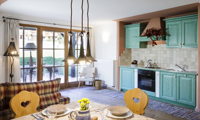 In the middle of the idyllic South Tyrolean mountains lies the holiday residence Chalet D'Ert, which enchants guests with a luxurious interior. The accommodation Junior Flat is located on the ground floor and has a spacious living room with a sofa bed, a well-equipped kitchen, one bedroom as well as one bathroom. It can therefore accommodate 4 people. The child-friendly holiday home also has with Wi-Fi, cable TV, a baby cot, a crib, a highchair and a storage room for your ski equipment with a ski boot dryer. The accommodation perfectly combines a charming country house style with original furnishings from Tyrol to make your skiing holiday an absolutely unforgettable experience and to guarantee a feel-good atmosphere. Outside there is a beautifully landscaped, fenced garden as well as a covered terrace with a table for pleasant hours in the fresh air with a fantastic view of the mountains. Within 6 km you will find several restaurants while a supermarket is only 3 minutes away by car. You can reach the popular skiing area Kronplatz comfortably via the cable car Piculin, which is 18 minutes away by car.