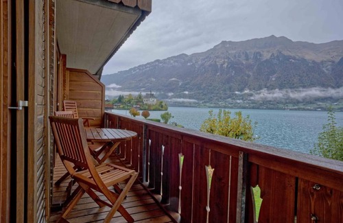 Cosy 3.5-room flat for 4 people in Iseltwald - balcony with view over the striking turquoise-blue colour of Lake Brienz and the mountains.
