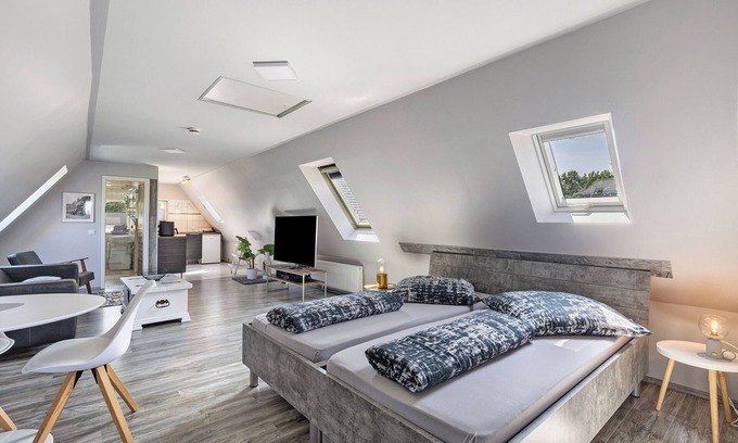 You can reach the studio apartment via a spiral staircase. It features an open-plan bedroom/living room and a bathroom with a glass shower. Through IPTV, you receive not only a wide range of TV channels on the flat-screen TV, but also internet radio from an extensive selection.