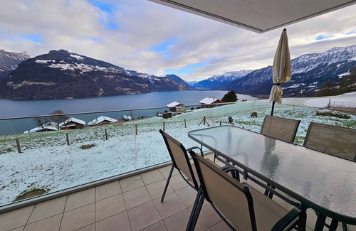 - Idyllic location with a unique view of the beautiful mountains of the Bernese Oberland, and over the whole of Lake Thun from Interlaken to Thun. The apartment is located on the edge of the village in nature, surrounded by a few houses.There are numerous excursion options for summer and winter sports throughout the year in the Bernese Oberland.There is a balcony on the north side and a seat on the south side. The apartment has 2 bedrooms, bathroom, fully equipped kitchen with dishwasher, large living room as well as TV and WiFi.