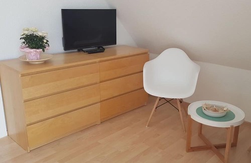Welcome to our bright, spacious and modernly furnished holiday apartment in the attic of our 2-family house. 2 roof terraces 1 living room with desk and satellite TV 1 bedroom with double bed, reading corner and satellite TV 1 bedroom with 2 single beds and large built-in wardrobe 1 dining hall with dining table, 6 seats and hall cupboard Well-equipped kitchen 1 bathroom with shower Flooring: tiles and light laminate Parking space on private property Separate, lockable garden room with power connection for bicycles Minimum rental period: 7 nights