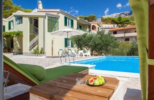 The accommodation in Villa Stina is for 8 persons in two separate apartments, one is for 2 people and the other can accommodate 6 people. In the bigger apartment there is one master bedroom furnished with wall to wall closet, king size bed, piano and a balcony looking over the pool and at the mountain Biokovo, there is a second bedroom with queen size bed with vanity, mirror an view of the pine wood, third bedroom is also looking at the pine wood and has 2 single beds. There is a bathroom with shower, kitchen with dining area and a big living room with large couch, flat TV and little library with art books and a comfortable armchair plus a work place with table and chair if you need to work. In the smaller apartment there is a master bedroom with king size bed and a living room incorporated with a small kitchen and dining area plus the bathroom with shower. Everything is wifi free and air condition. Owners live on the property but you have complete privacy because they have their own entrance in the house. You have your own garden, yard, parking and if you need anything you can allways ask us. We are at your disposal.