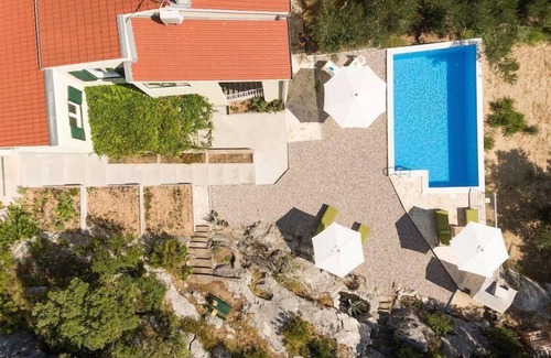 Outdoor area is in the pine wood surrounded by olive groves. We have a beautiful garden and yard with sitting and dining area. A summer kitchen is near the pool and there is an outdoor barbecue. We encourage our guests to come in the autumn and pick olives with us. You can just hang around enjoying in the swimming pool, sun bathing or you can rest drinking mint tea from our garden. The swimming pool offers a breathtaking view of the nearby mountain and nature park Biokovo. There is a nature rockery garden with indigenous plants and succulents.
