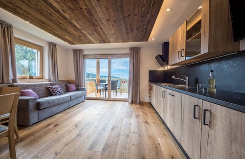 Just outside the village of Vöran (Verano), Kuenhof farm is located on the sunny high plateau of the Tschöggelberg, at an altitude of 1.450 m. Surrounded by forests and meadows, the modern Kuenhof apartments were built in 2019 and are very child-friendly, offering a playground and childrens equipment such as cutlery, amongst other things. The apartment Lavendel consists of a living/dining room with a sofa bed for 2 people and a kitchenette with a dishwasher, 2 bedrooms (one with a single bed and a bunk bed and one with a queen size bed) as well as one bathroom and can therefore accommodate 7 people. Additional amenities include Wi-Fi and satellite and cable television and underfloor heating. Furthermore, a baby cot and a high chair are available upon request. A common recreation room with a library and board games is also available for your use. The highlights of this apartment are definitely its private balcony as well as its infrared sauna cabin in the bathroom. Start your day with a delicious breakfast on your balcony while you admire the stunning view of the mountains. In an 8-10 minute drive you will reach a selection of restaurants and the nearest supermarket. Take a trip to the picturesque city of Meran (Merano), an approximately 23-minute drive away, and enjoy all it has to offer - from churches, museums and shops to idyllic walking paths and gardens. Furthermore, the apartment is the ideal accommodation for nature and sport lovers as it is situated directly by hiking trails. The Ski resort Meran 2000 is also only a 21-minute drive away (13.4 km)