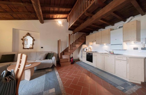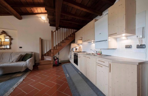 APARTMENT for up to 6 persons lake view located in the beautiful Villa da Sacco in Colà di LAZISE. The flat is on 2 floors and is located on the second floor. It has a spacious living room with kitchenette, a large sofa/double bed, a double bedroom and bathroom with shower. A wooden staircase leads to the mezzanine floor (maximum height 2.10 m), with 2 rooms and a utility room where there is another sofa bed for 2 people. Heating with methane gas. Characteristic feature of the property is the exposed wooden ceiling. It has a garage with up-and-over door and an outside parking space of its own. There is air conditioning in the flat.Animals are unfortunately not allowed.The Villa da Sacco dates back to 1880 and was renovated in 2003. It has a large park of about 20000 square metres overlooking the hill where the historic centre of Colà is located. Inside the property, in addition to charming footpaths, there is a beautiful swimming pool with a solarium area and other common areas. The area is extremely quiet and within easy reach of essential services such as supermarket, bars and restaurants. Just one km away is the beautiful Cedri thermal park. The lake is only 3 km away and the Affi exit can be reached in less than 10 minutes.