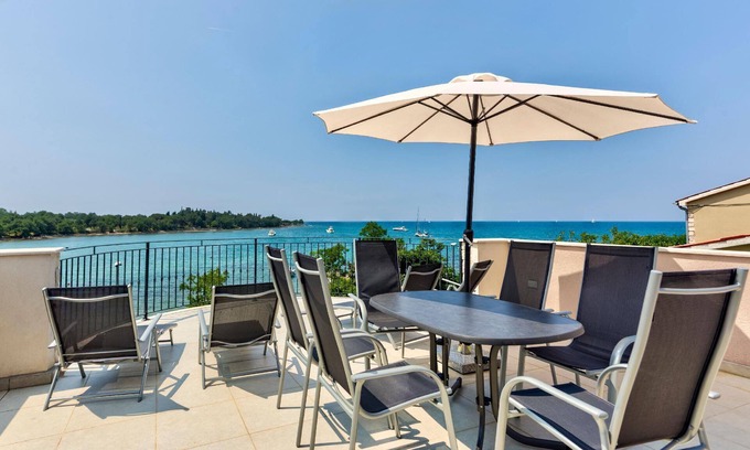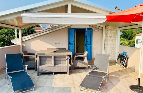 The holiday apartment A3 is in a quiet and peaceful neighbourhood in a new house with a wonderful sea view. The beach is just ten metres away. Enjoy the microclimate of the north-west of Istria and swim in the clear and clean Adriatic Sea.