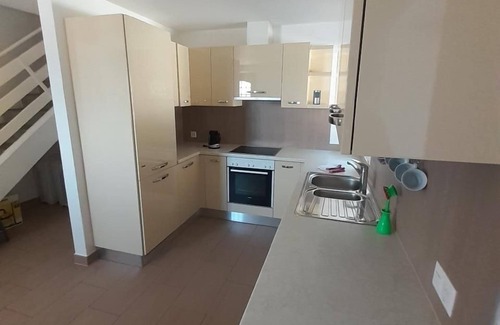 Inside, the ground floor flat has an entrance hall leading to a fully equipped kitchen with dishwasher, fridge, freezer, kettle and Nespresso coffee machine for your cosy mornings. A shower room, with shower, washbasin and WC, is equipped with a washing machine and tumble dryer for your convenience. On the 1st floor, accessible by stairs, there is a large living room with TV, a single bed (90cm), as well as three bedrooms offering various sleeping configurations, including a double bed (140cm), a single bed (90cm) and a bunk bed (90cm). Towels and bed linen are provided free of charge.