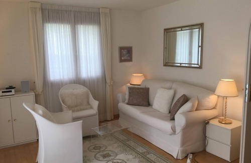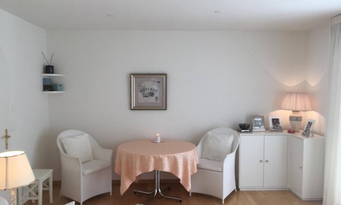 First-class 2-room flat with separate kitchen, bathroom and large outdoor seating area. The elegantly furnished flat has a living room with a sofa and a dining area for four to six people. The second room is a bedroom with two single beds, bedded like a double bed. There are plenty of cupboards in all rooms and in the corridor. The kitchen is separate and has a small area with a hob, dishwasher, oven and a seating area for two people. The bathroom has a bathtub, a WC, a double washbasin and a mirror cabinet. In front of the living room there is a large seating area with a view of the mountains and plenty of sun from around 11 am. A parking space in the underground car park is reserved for you (parking space no. 6). There is also a ski room with a ski locker in the basement (no. 5). Use of the communal washing machine and tumble dryer in the basement is possible. The flat is only rented to adults.