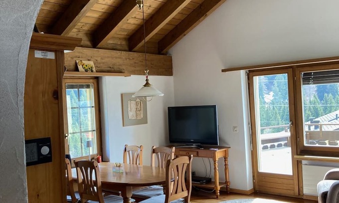 We rent daily (minimum 2 nights), weekly or monthly 3.5-room flat in Medels im Rheinwald (2.9 km from Splügen, 17 km from San Bernardino, 64 km from Bellinzona). The 3.5-room penthouse apartment (70 m²) is located in a holiday complex: it has central heating with oil: it is on the 3rd floor, no lift. Availability for 6 beds (one 160 cm bed + one 140 cm bed + one bunk bed). Kitchen with dishwasher + oven + microwave + 4-ring electric hob. Towels + sheets + hairdryer available. Present a beautiful wood-burning fireplace. Bluetooth speaker + Wlan. There is a table with 4 chairs on the terrace. Washer and dryer present in the residence (+ iron) One indoor parking space in garage + 1 outdoor parking space available. Animals welcome. Bus stop is 100 m awayIdeal for beautiful walks in the beautiful nature of Graubünden starting directly from the house