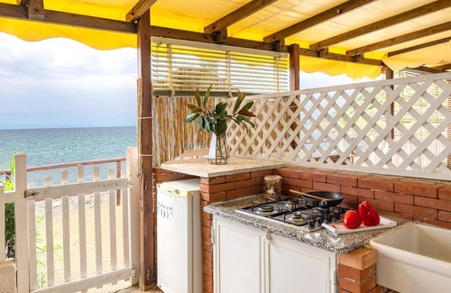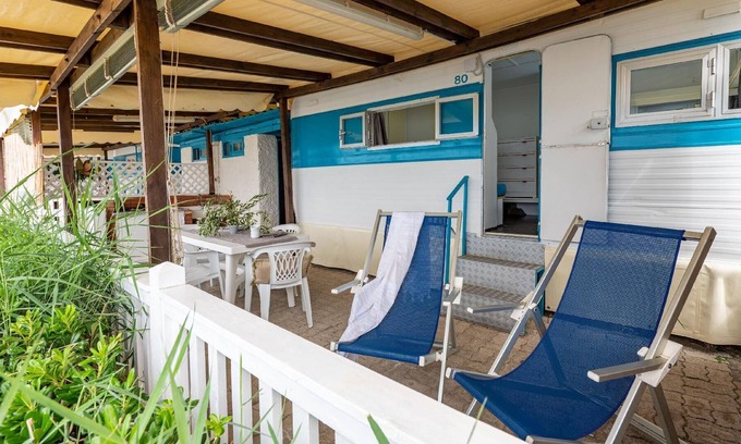 Fixed Caravan, located a few meters from the sea. From 2 to 4 beds with fan. Consisting of a double bed and 2 single beds. Private services with external entrance. Gazebo, outdoor kitchen, fridge, table, chairs and two deckchairs. Possibility to include a fifth bed upon request. Bed linen and bath towels are available only with meals subscription.