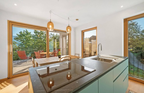 An exclusive retreat with impressive views over Merano to the Texel Group and the Passeier Valley. In Völlan, 600 m above sea level above Lana, you will find the modern Residence Plattwies, designed by an architect. The building houses four apartments. The first-floor apartment is rented out as a holiday apartment or for longer stays. The high-quality construction as a climate house is designed in every detail for maximum living comfort. Great importance was attached to ecological building materials. The house welcomes you with warm brown tones and is located in an agricultural setting near the edge of the forest, with a house garden, fruit trees and a small vegetable patch.