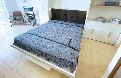 Studio Apartment Pool View sleeps 3. Independent entrance. Living room with kitchenette and dining table. Foldaway double bed. Single sofa bed. Ceiling fan. Bathroom equipped with aerator with shower cubicle. Outdoor space equipped with table, chairs and umbrella for having lunch outside. Access to the large and small swimming pool, sauna, changing room. Discount when booking an umbrella on the “Lo Scoglietto” beach.