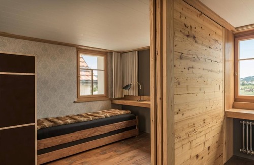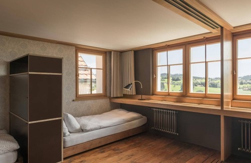 Spending the night here, with a unique view over the Appenzellerland as far as the Säntis, is an experience in all seasons.in the stylishly renovated, listed house on the historic village square of Rehetobel, old building fabric is combined with modernity.the five-storey, stately house has served several purposes in its 230 years. Where there is now a pretty "Beizli", the "Gasthaus Dorf5", with a wonderful garden inviting you to linger, there used to be the Rehetobel post office.the upper floors, which served as a telegraph office and business premises, now house three flats with a high standard of finish.the spacious, light-flooded flat offers a 180 degree view, a beautiful balcony and spacious living rooms with a fireplace. Sliding doors allow the rooms to be converted according to requirements, while the natural building fabric with lots of wood and the generous furnishings are of a high technical and aesthetic standard. The central location in the Appenzeller Vorderland is ideal for exploring the Alpstein region, the nearby Lake Constance region and the extremely attractive city of St.Gallen.The flat on the second floor offers plenty of space for two to four people and you will find many cosy places to linger. Cooking in the modern kitchen is a pleasure - or would you prefer to be spoilt in the "Beizli" downstairs? for more than four people we recommend the "Alpsteinpanorama" flat in the same building.