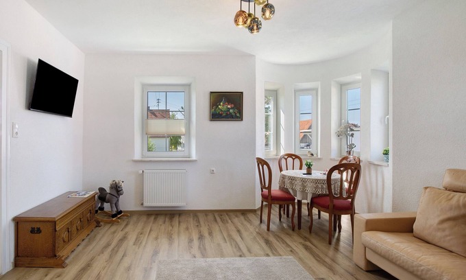 The newly renovated holiday apartment Villa Romantika - Fewo OG rechts is located in Ichenhausen and is ideal for an unforgettable holiday with your loved ones. The 45 m² accommodation consists of a living room, a kitchen, two bedrooms and a bathroom, and can accommodate up to five people. The first bedroom has a double bed, the second bedroom is equipped with a bunk bed: below there is a 140 cm sleeping area for up to two people, above a 90 cm sleeping area for one person. Amenities also include high-speed Wi-Fi (suitable for video calls) and a smart TV with streaming services. The holiday accommodation has a private balcony where you can relax in the evening. Legoland Günzburg is only an 8-minute drive and 8 km from the accommodation.