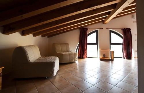 The studio is located on the first floor and consists of a large living room with kitchenette and bathroom. The bright attic room welcomes you with its wooden beams and a homely atmosphere that invites you to relax and unwind. The living room has a kitchenette with a gas cooker and refrigerator in the dining area, as well as a table and chairs for communal meals. The sleeping area is equipped with a double bed and two single beds. The bathroom is equipped with a shower and hairdryer. The flat is also equipped with air conditioning, television and Wi-Fi. A particularly noteworthy feature of this property is the view of the beautiful Mincio river valley.