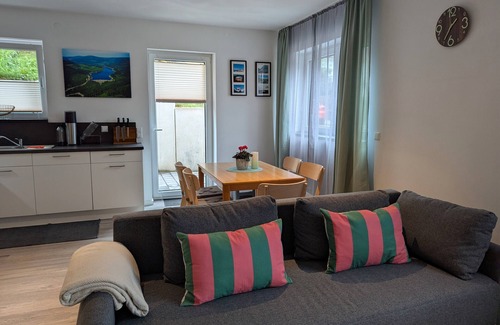 The holiday apartment Schiller's Urban Escape is centrally yet quietly located in Freudenstadt. The 72 m² accommodation consists of a living room with a sofa bed for one person, a bedroom with an additional sofa bed, a bathroom, and accommodates up to 4 people. The kitchen is fully equipped with an induction stove, oven, dishwasher, sparkling water maker, kettle, and coffee machine. Amenities include high-speed Wi-Fi (suitable for video calls), a smart TV with streaming services, a sound system, Bluetooth speakers, a washing machine, as well as children's books and toys. A baby cot and a high chair are also available. The private outdoor area includes an open terrace and a barbecue.