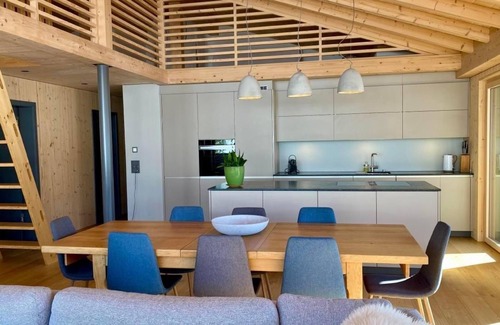 Horizon 4 is located on the top floor and has a large panoramic window with a view of the mountains, landscape and lake.