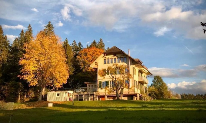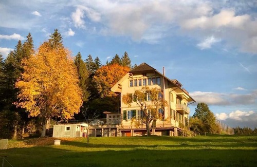 We rent two stylish apartments in a former 100-year-old school building in the middle of the Emmental at almost 1000 meters above sea level. You're looking now at the bigger appertement. If you like animals and nature, this is the place for you. The house is in front of the forest and you have a fantastic view from the Jura to the Alps. If you really want to relax, you can also order dinner and we bring it in the apartment if you wish.
