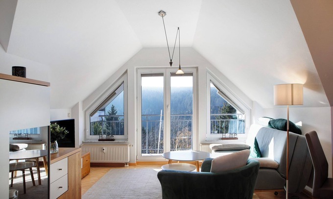 Welcome to the holiday apartment Tannenblick 7.5 in Oberhof – with mountain view, sauna and comfort. Enjoy your stay in the stylishly furnished holiday apartment Tannenblick 7.5, located in the heart of Oberhof, offering a wonderful panoramic view of the mountains and a barrier-free interior.