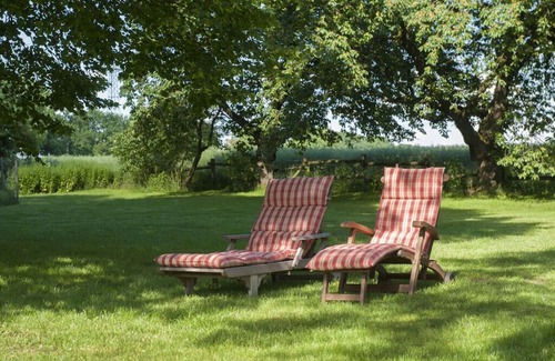 The holiday apartment for 2 people, which was renovated in 2016, is located in the former stable area of the thatched farm. Since October 2022 there has been a completely new oak beam bed in the bedroom. The holiday apartment was completely renovated with natural materials (clay, wood fiber, wood and stuffing hemp) and furnished in a stylish and comfortable manner in accordance with its previous use. On approximately 42 m² there is a beautiful shower room, a separate bedroom with a view of the garden and fields as well as a large living and kitchen area. The outdoor sauna is just 20 m away. The loungers are available in the garden. There are beautiful shaded areas under the large, old linden trees or sunny areas on the lawn. The fire basket invites you to relax in the evening.