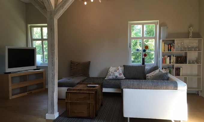 The family apartment is located in the listed historical grain mill, in an idyllic landscape on Gera and Steigerwald. Here you will find the perfect apartment near the center of Erfurt to visit Erfurt and its surroundings. Feel at home in the renovated apartment and enjoy the advantages of modern accommodation. In the immediate vicinity is the Bachstelzencafé, a popular excursion destination for Erfurt on weekends. A supermarket can be reached on foot in 10 minutes. There is also a pharmacy, bank, post office and various restaurants and beer gardens in the village. The old mill building is located northeast of the historic village center, nestled in the glacial valley of the Gera on the edge of the Steigerwald. It was first mentioned in 1667, but existed centuries ago as a grinding and oil mill. It is one of the few preserved container houses in Thuringia. After centuries of operation, the mill was shut down in 1990 and revived in summer 2014 after high-quality renovation. A careful renovation of existing buildings from the point of view of the preservation of historical monuments allows the interior and exterior wooden structure to be experienced. Bright and light-flooded rooms, an open-plan living, dining and kitchen area, modern architecture, high-quality materials and the flair of the adjacent old factory building make this apartment something special.