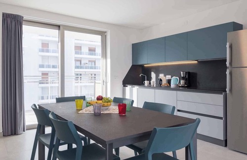 The holiday apartment is located in an apartment house and is furnished in a modern style. The property is located in a busy environment, in the town centre. Available for your exclusive use: sun lounger, terrace and garden furniture. The apartment has a terrace (87 m2). PETS:: Only small dogs up to 20 kg allowed. Please specify your dog's size when bookingLocationLignano, district Sabbiadoro. The landlord does not live in the house or on the property. The holiday apartment is also suitable for people with disabilities Parking (for 2 cars) is available on the property. Each apartment has a parking space for 2 cars (no minibus) Specialair conditioning, central heating. WLAN is available to guests. It is a light wifi, so neither streaming nor downloading is allowed.